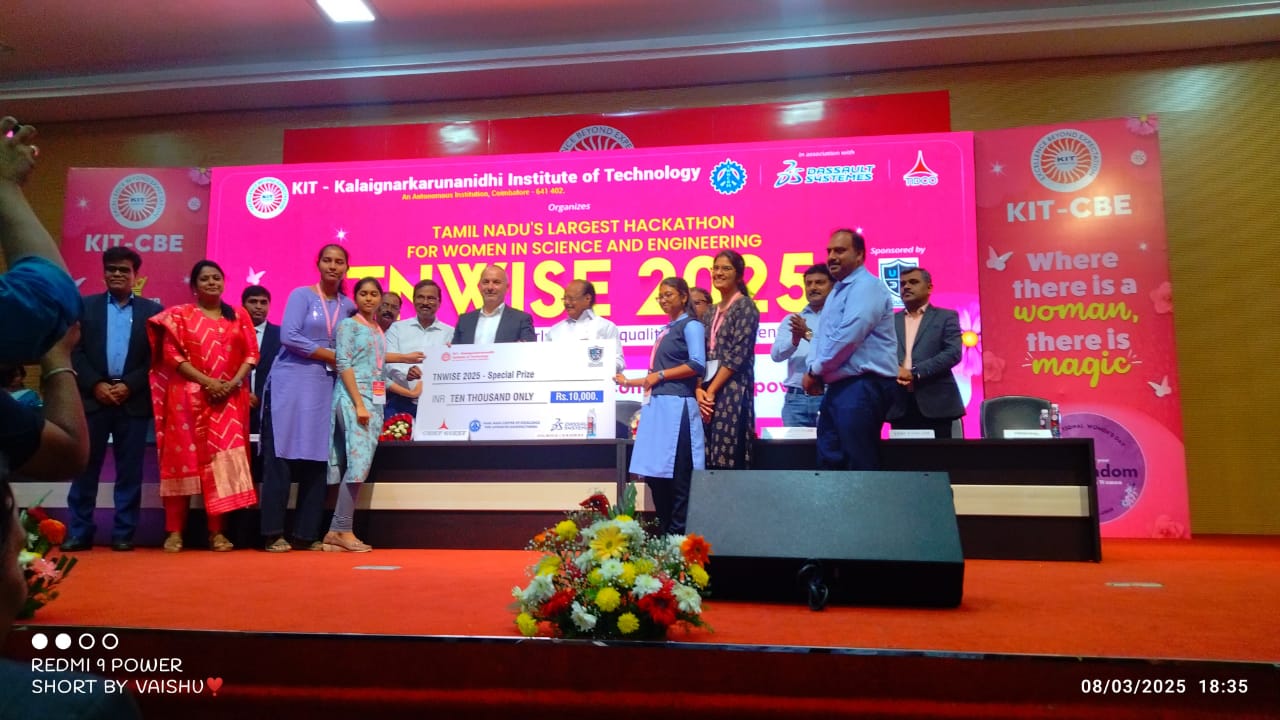 V. Prithika of III Year Won Special Prize Rs.10,000 for “AI Power CBC and Mood Tracking App” in Tamil Nadu Largest Hackathon for Wowen in Science and Engineering (TNWISE 2025) on 08-03-2025 at KIT, Coimbatore.