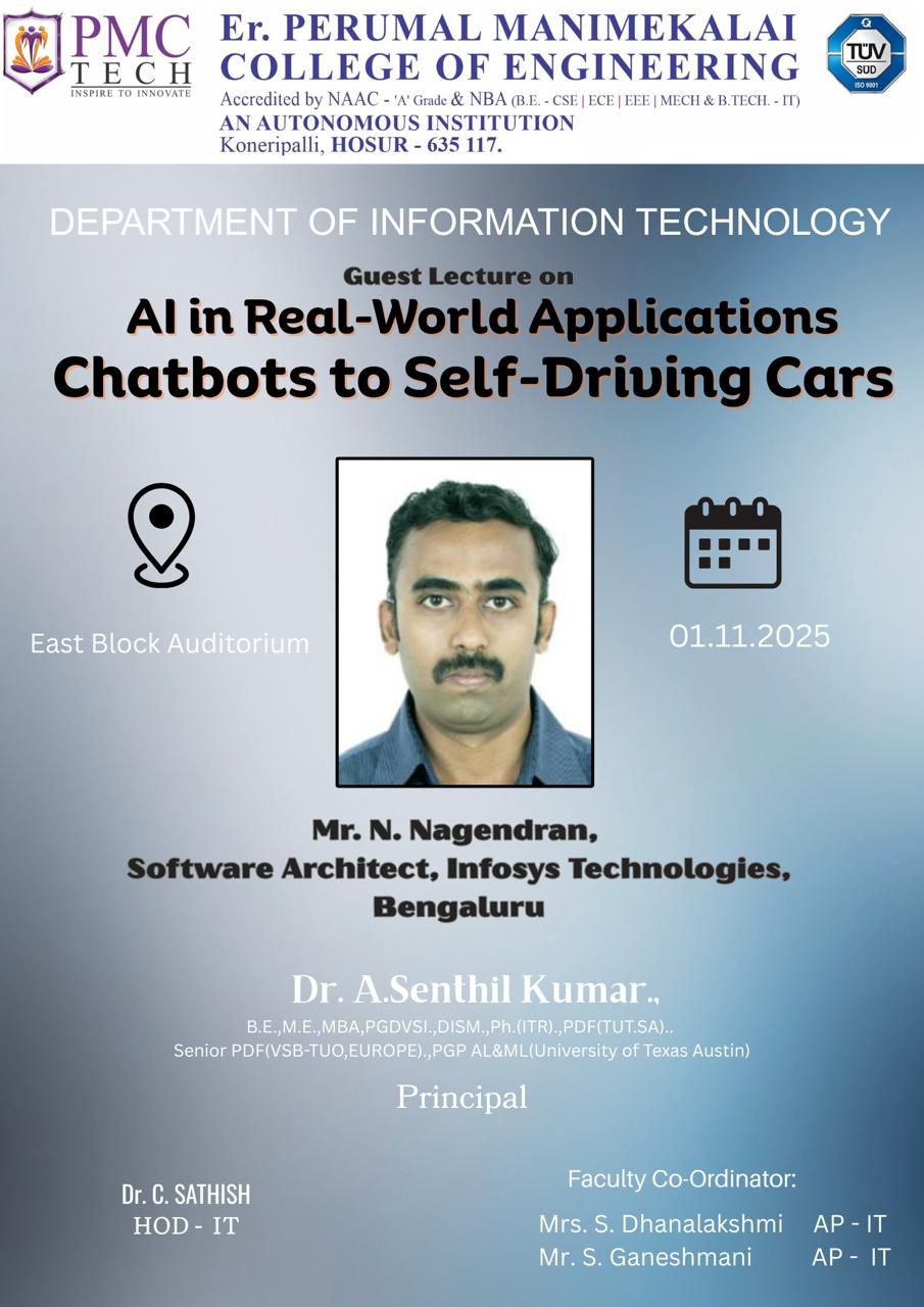 đź’ˇ Guest Lecture on AI in Real-World Applications: From Chatbots to Self-Driving Cars organized by Dept. of IT on 01st November 2025