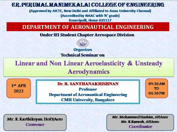 The Department was started in the year 2007. The Department offers a 4-Year full time B.E. programme in Aeronautical Engineering; a 2-year full time M.E. programme in Aeronautical engineering and it has a team of well-qualified faculty members with rich industrial and academic experience.
