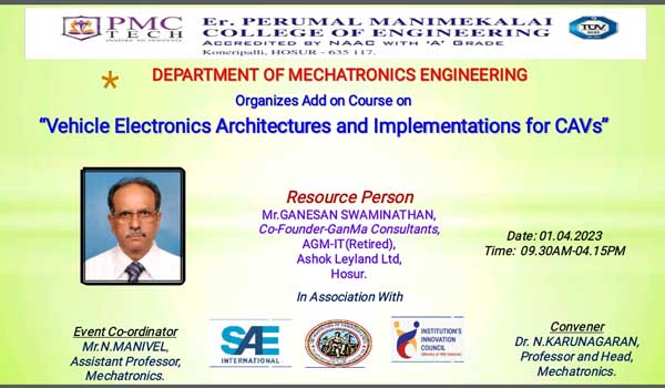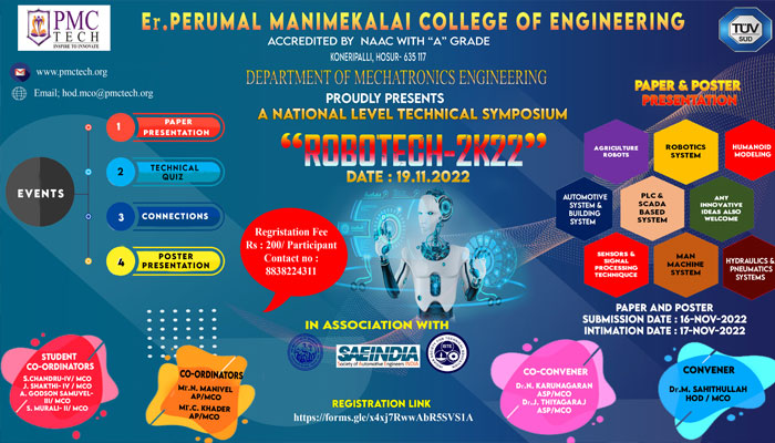 To create a centre of excellence by imparting relevant technical knowledge and wisdom to the students’ through innovative teaching and extensive practical exposure in the field of mechatronics coupled with relentless rendezvous in research to excel in their chosen career.